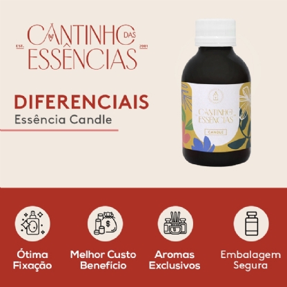 As Essências Candle são exclusivamente para a fabricação de velas. Sua formulação foi testada e aprovada para fabricação de velas cuja a matéria prima utilizada pode ser: parafina comum ou parafina gel (à base de óleos minerais), parafina eco mix (à base de soja), e cera de coco (à base de manteigas vegetais).
