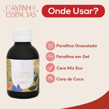 Indicada para fabricação de velas artesanais cuja a matéria prima utilizada pode ser: parafina comum ou parafina gel (à base de óleos minerais), parafina eco mix (à base de soja), e cera de coco (à base de manteigas vegetais).
