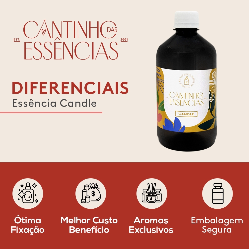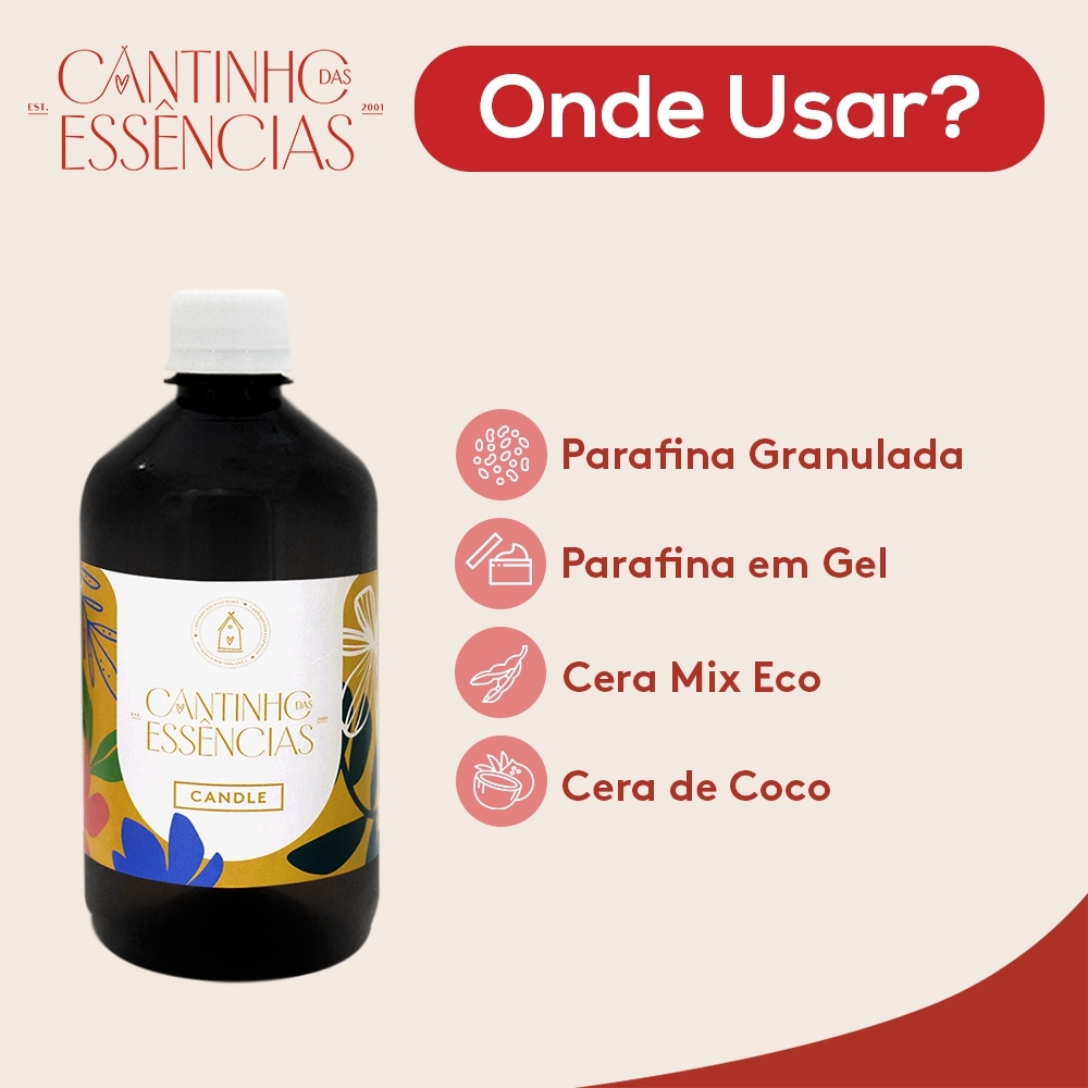 As Essências Candle são exclusivamente para a fabricação de velas. Sua formulação foi testada e aprovada para fabricação de velas cuja a matéria prima utilizada pode ser: parafina comum ou parafina gel (à base de óleos minerais), parafina eco mix (à base de soja), e cera de coco (à base de manteigas vegetais).